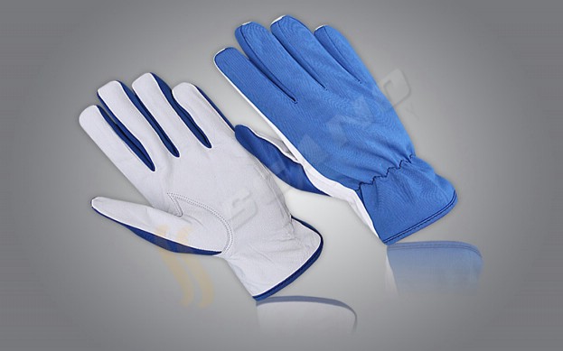 Palm Crust Goatskin Leather Back Light Blue Color Britex Fabric, Without Fingers Tips, Keystone Thumb, Inside Full Fleece Lining & Blue Color Piping.