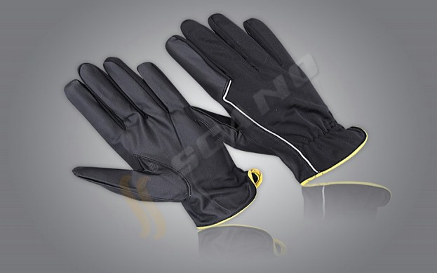 Palm Artificial Leather Back Black Color Britex Fabric, W/O Fingers Tips, Index Fingers, Keystone Thumb, Yellow Color Border and Elastic wrist.