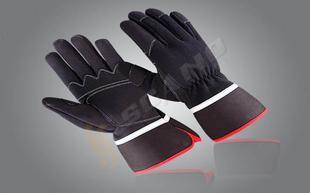 Palm Black PU Synthetic Amara Back Black Fourway, Index Fingers, 03 Fingers Tips, Keystone Thumb, Reinforcement on Palm, Reflector Tap, NeopreneCuff and Red Piping.